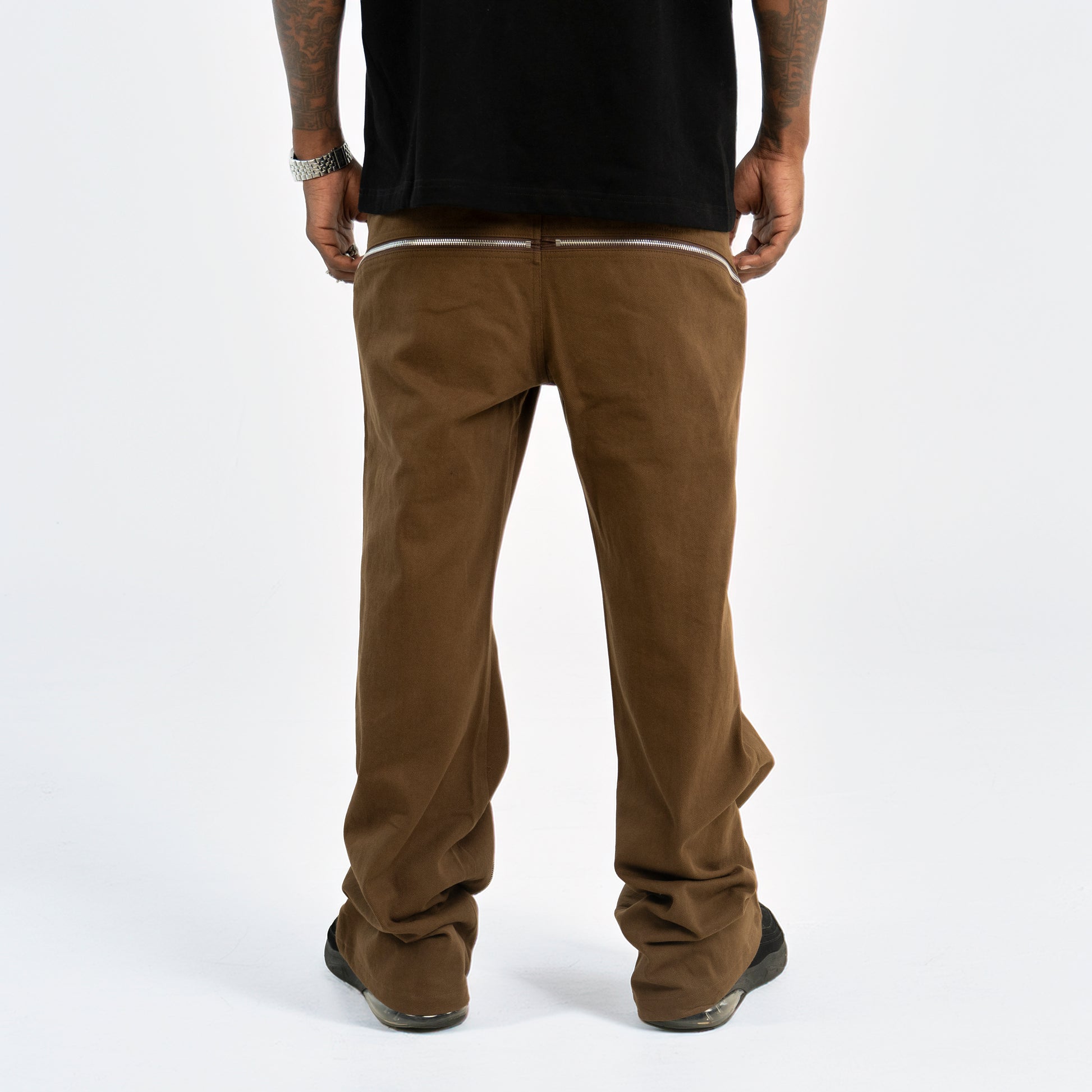 Flare denim trousers with a full- length side zip that extends from the back for a bold and functional detail. Crafted from high- quality heavyweight cotton denim and finished with a grey leather patch on the back waistband.